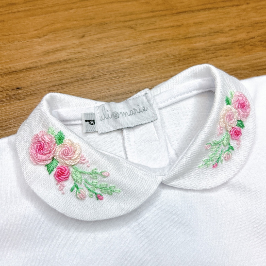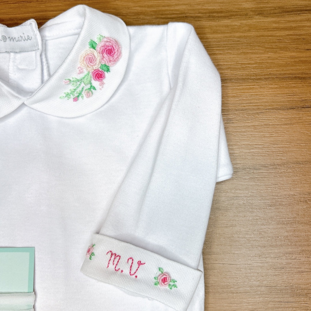 O grande diferencial deste body está na personalização: a inicial da bebê é bordada à mão no punho com todo carinho, o que torna cada peça única e exclusiva. Por ser um trabalho manual, o bordado pode apresentar leves variações de cor e tamanho.