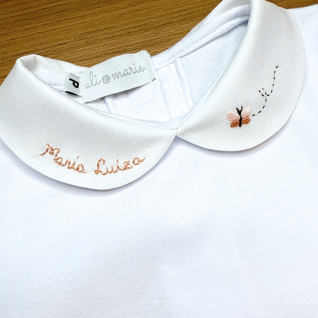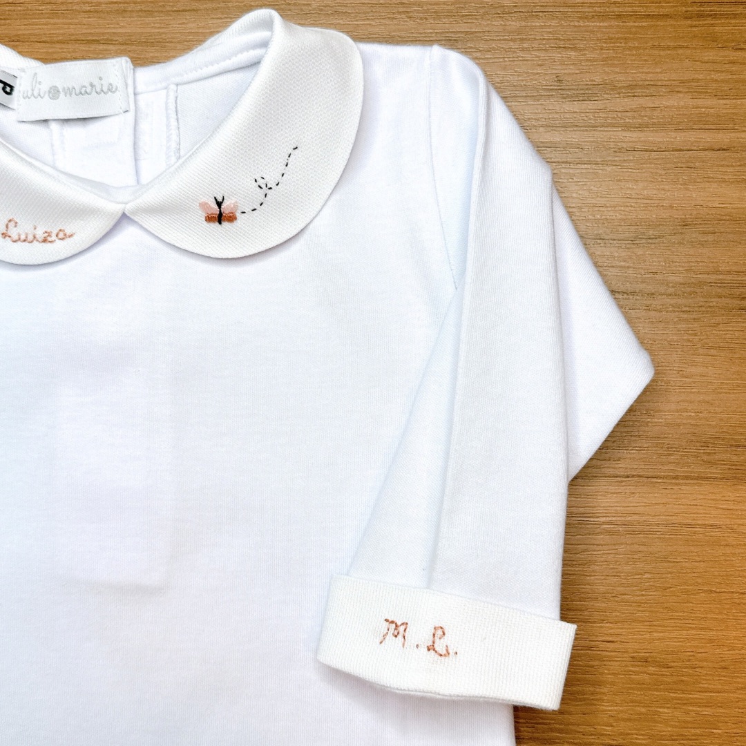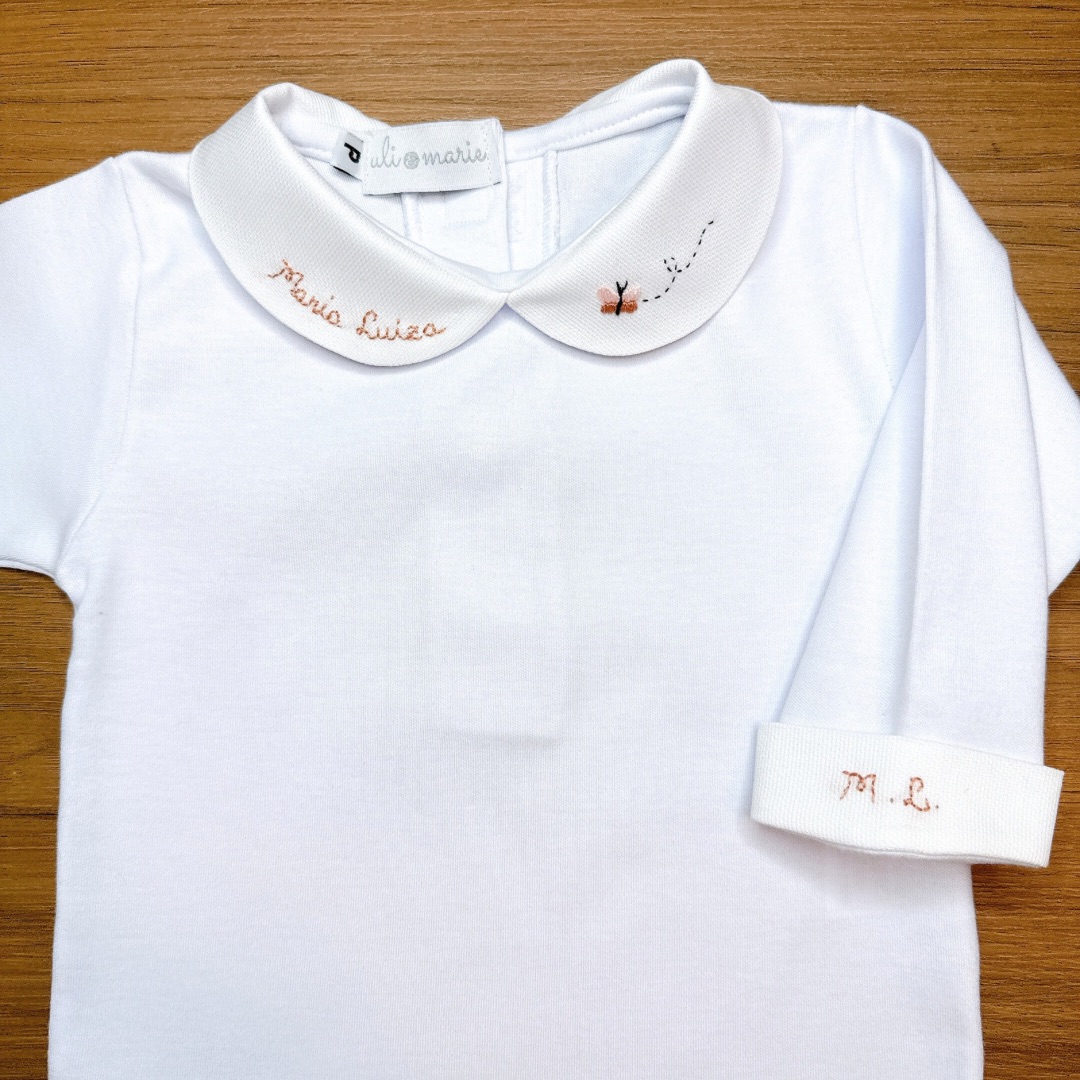 O Body Borboleta é uma peça delicada e exclusiva, confeccionada em Suedine 100% para proporcionar máximo conforto ao seu bebê. Com bordado artesanal em tons de rosa bebê, ele se destaca pelo acabamento refinado e pela personalização especial com o nome da bebê bordado no punho.