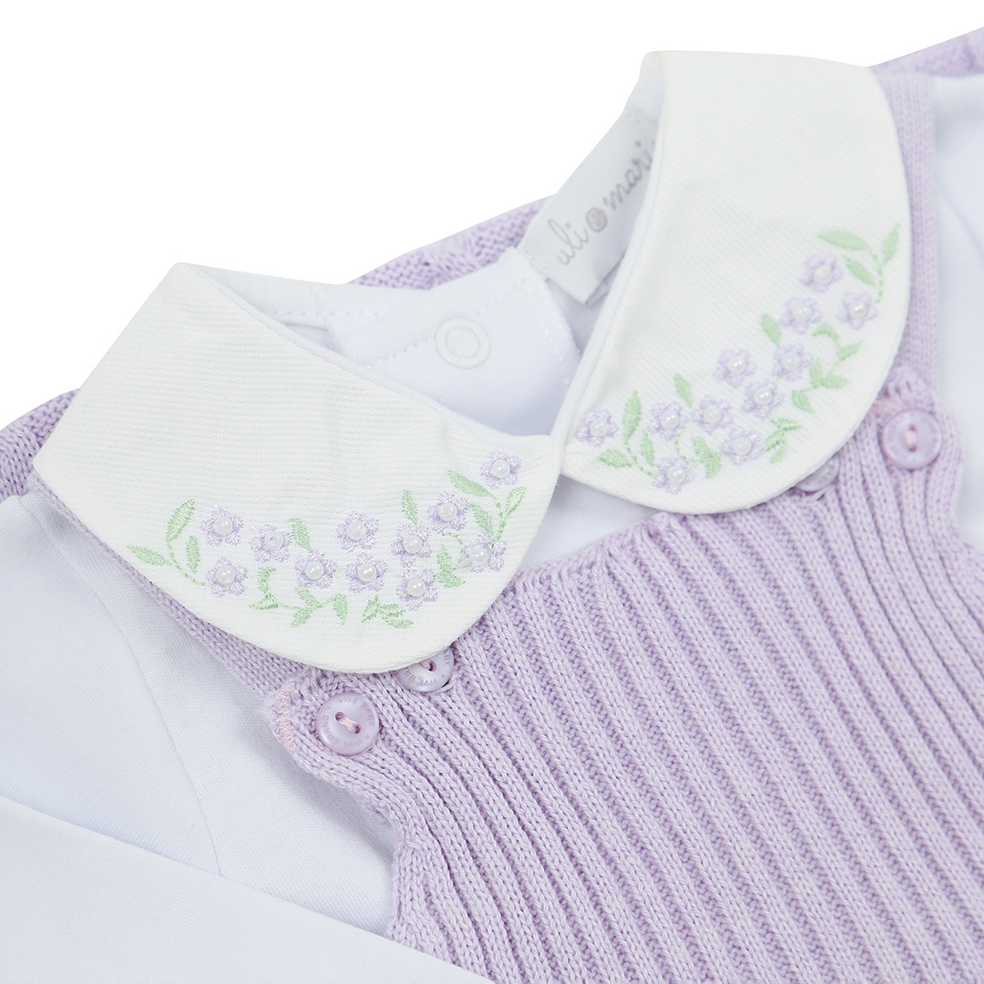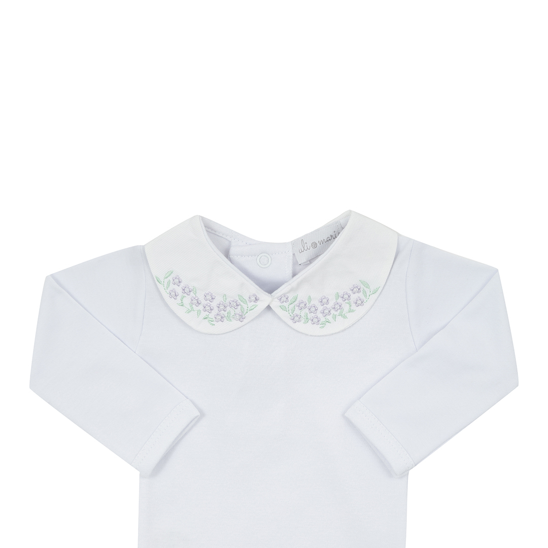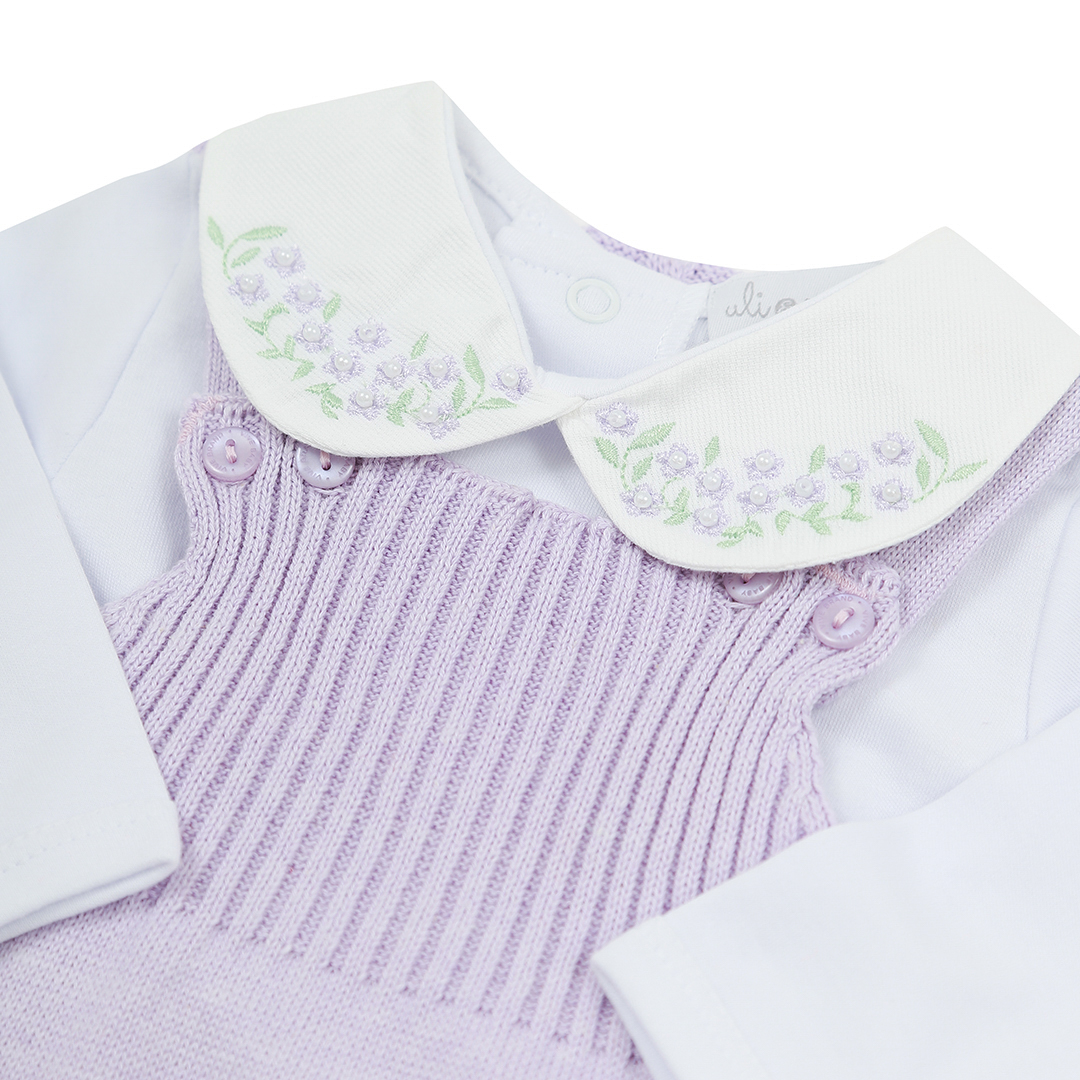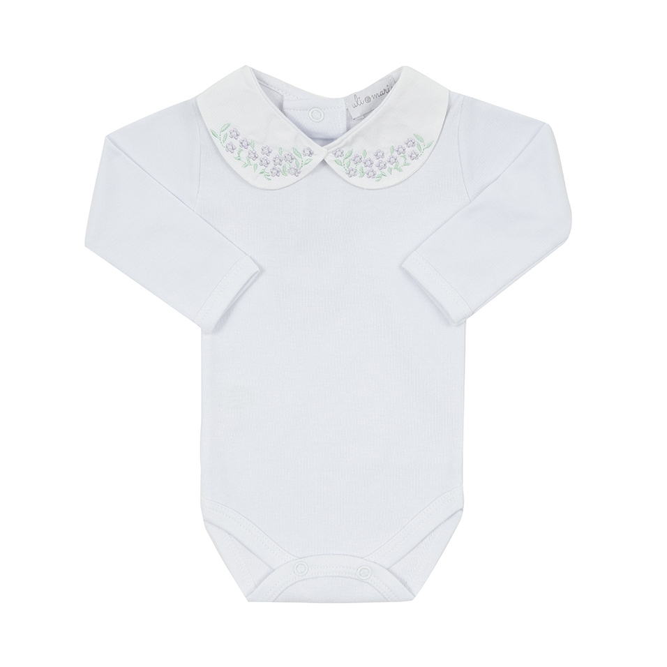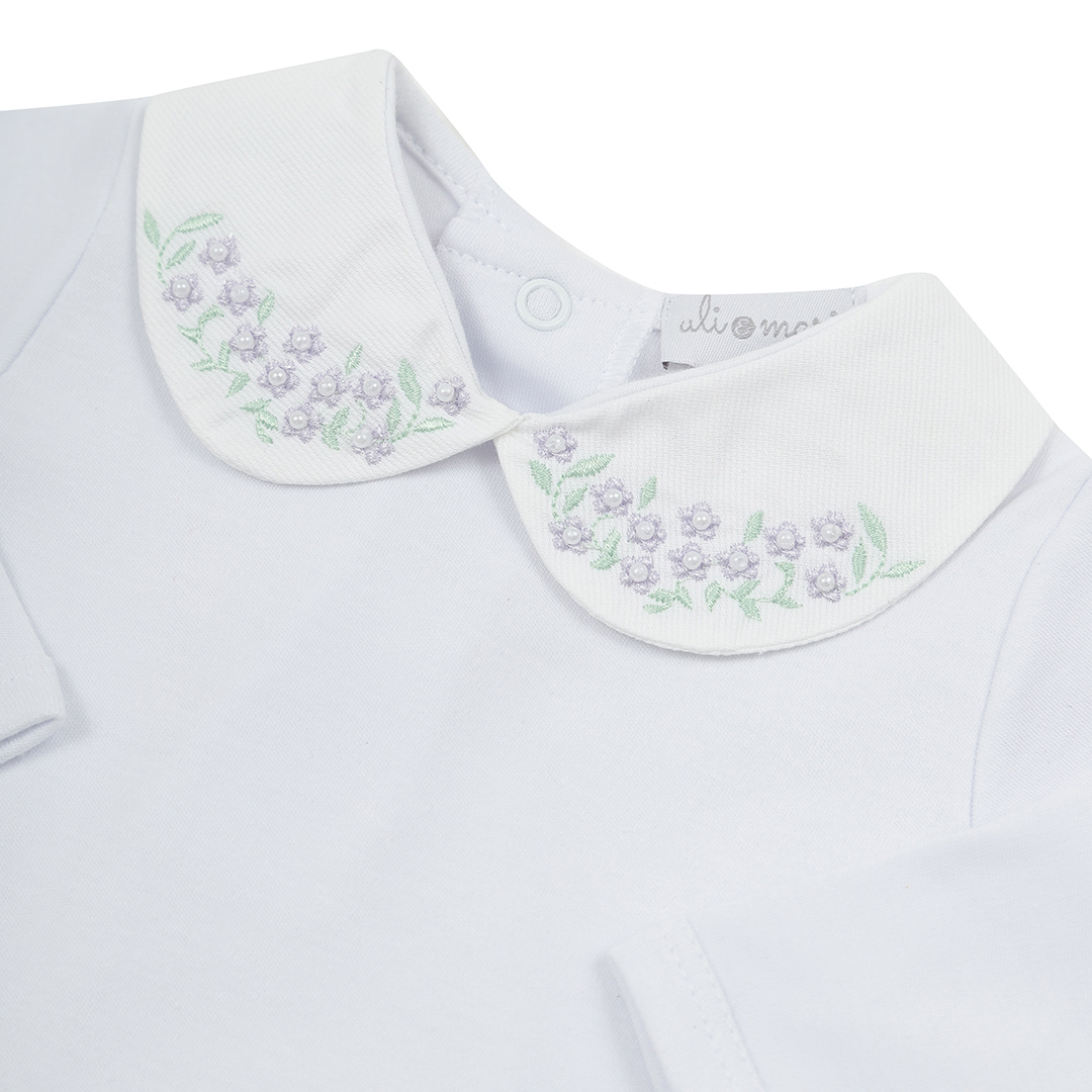O grande diferencial desse body está na sua gola redonda bordada à máquina com mini flores lilás e aplicação manual de mini pérolas, um detalhe sofisticado que torna a peça ainda mais especial. Para maior praticidade no dia a dia, conta com botões de pressão nas costas e entre as perninhas, facilitando as trocas do bebê.