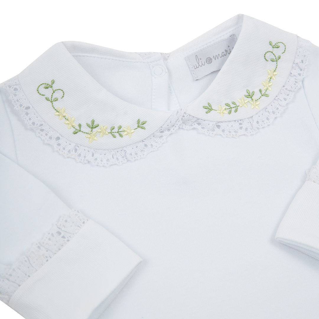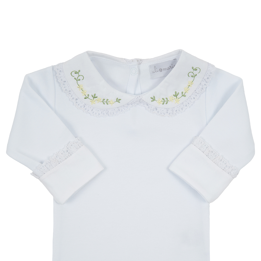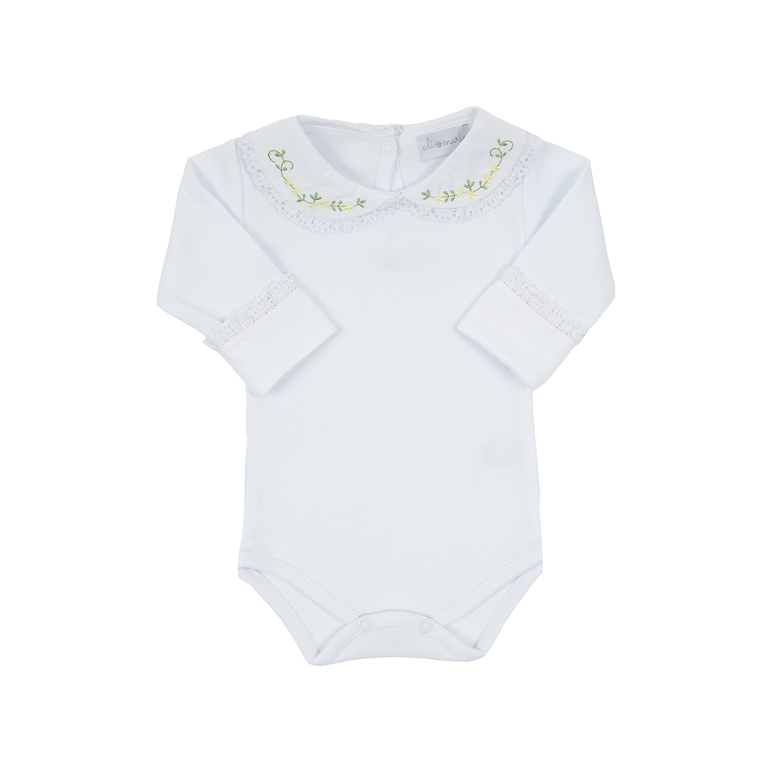 Seu design encantador traz uma gola delicadamente bordada à máquina com um charme floral em amarelo bebê, finalizada com um acabamento refinado em renda. Esses detalhes garantem um visual clássico e atemporal, tornando o body uma peça essencial no enxoval.