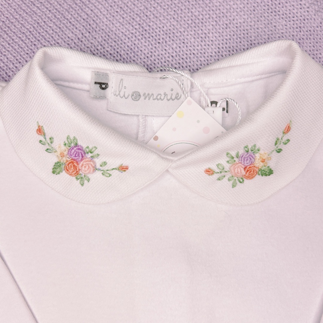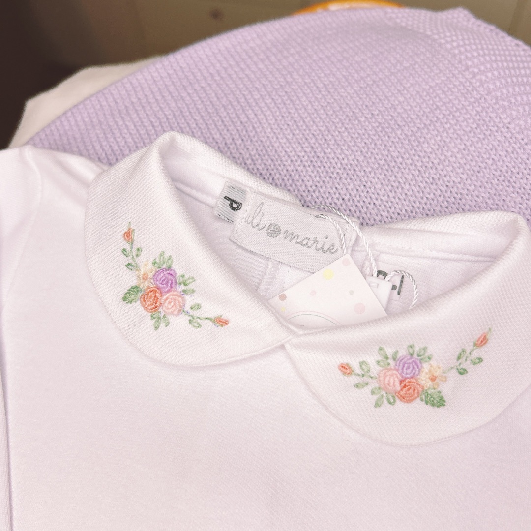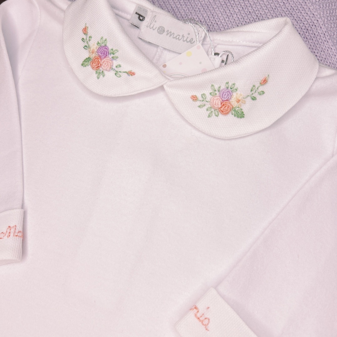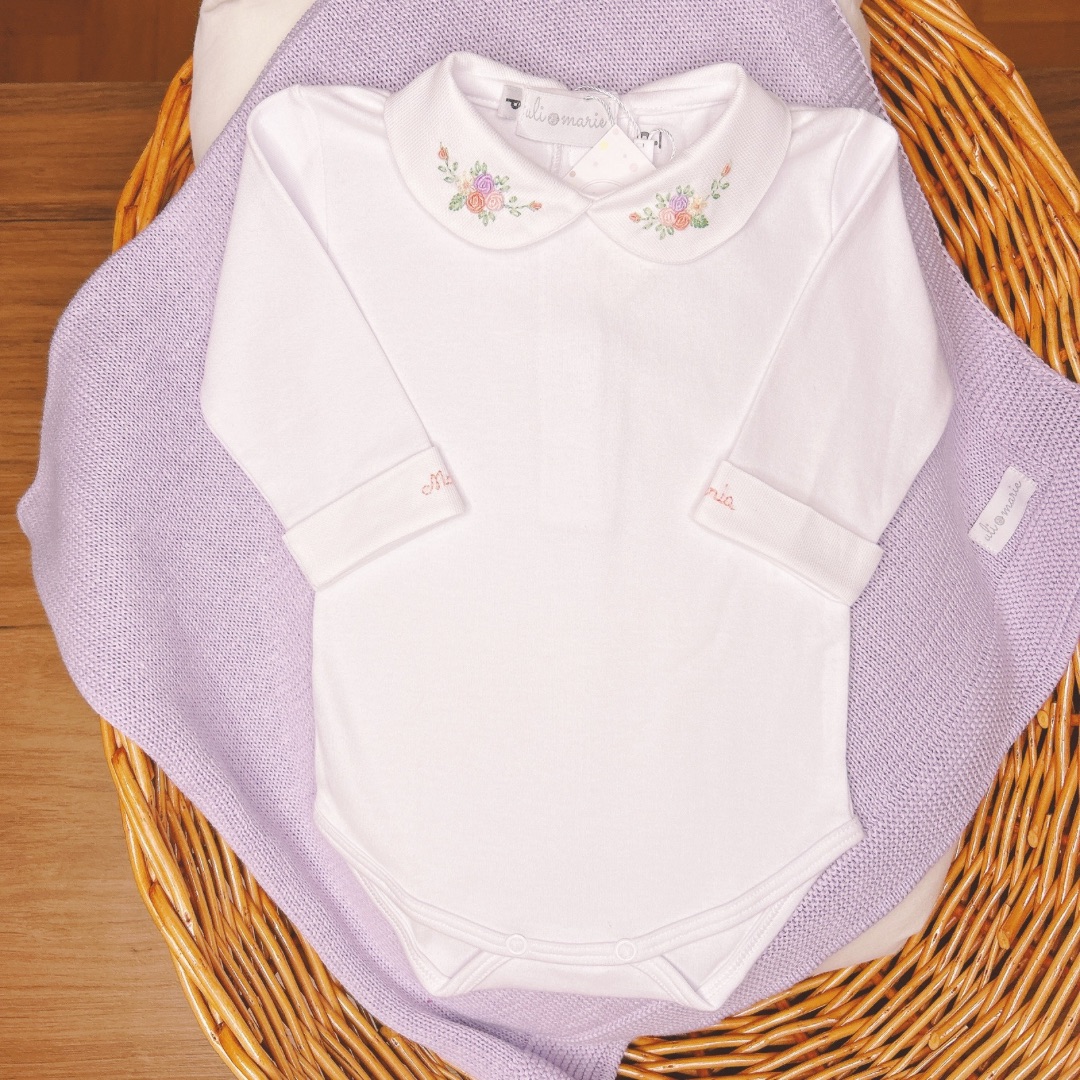 O Body Maria é uma peça delicada e exclusiva, confeccionada em Suedine 100% para proporcionar máximo conforto ao seu bebê. Com bordado floral artesanal em tons de lilás, rosa bebê, rosa antigo, verde e off-white, ele se destaca pelo acabamento refinado e pela personalização especial com o nome da bebê bordado no punho.
