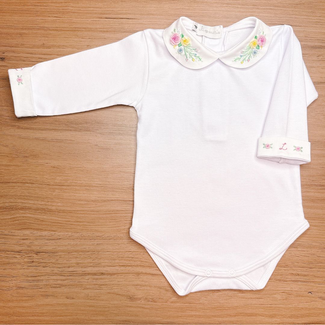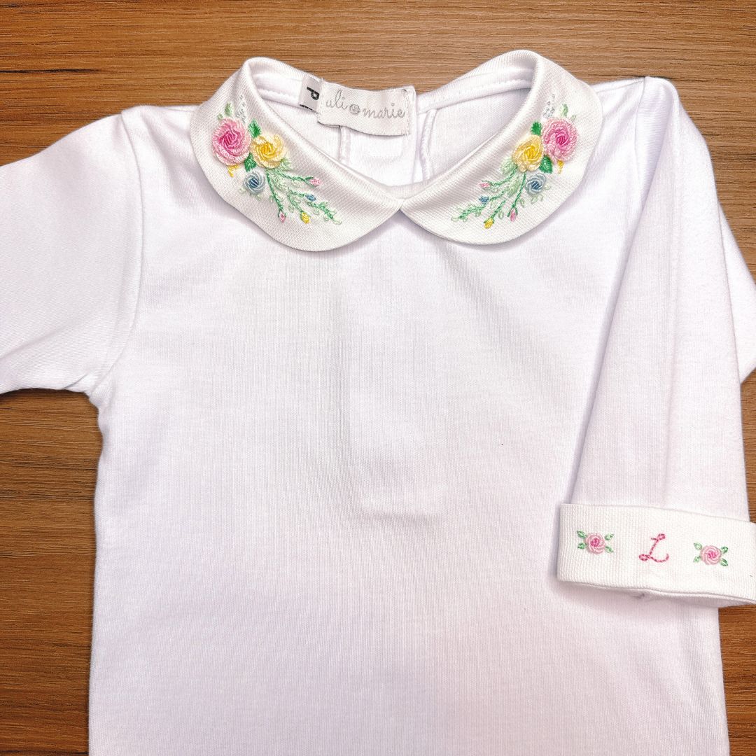 O grande diferencial deste body está na personalização: a inicial da bebê é bordada à mão no punho com todo carinho, o que torna cada peça única e exclusiva. Por ser um trabalho manual, o bordado pode apresentar leves variações de cor e tamanho.