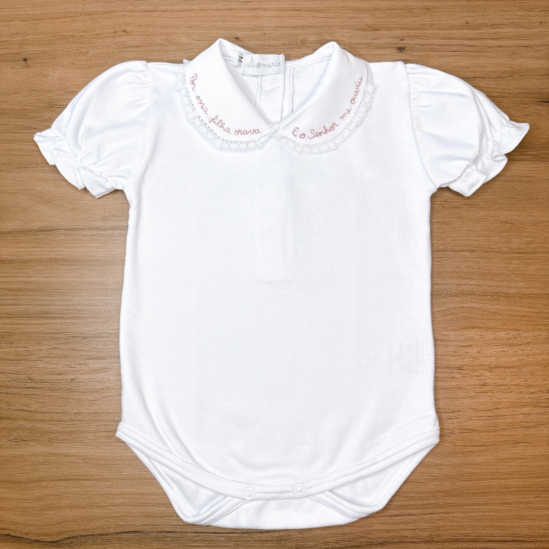 Esse Body Personalizado é confeccionado em SUEDINE 100% algodão, possui toque macio, gola redonda lisa com acabamento de rendinha e manga fru fru. O fechamento em velcro nas costas e botão de pressão na entreperna garantem praticidade na hora da troca.