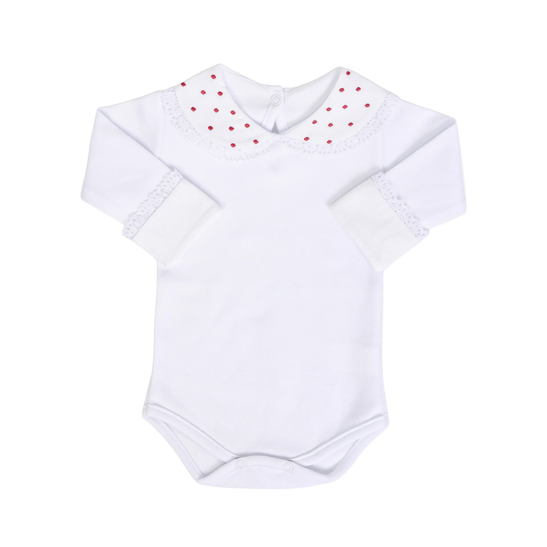 O Body Poá Vermelho combina conforto e delicadeza, sendo confeccionado em algodão egípcio, um tecido de toque extremamente macio e ideal para a pele sensível do recém-nascido. A gola é um verdadeiro destaque, com um bordado delicado feito à máquina de poá e acabamento refinado em rendinha, proporcionando um charme extra à peça.