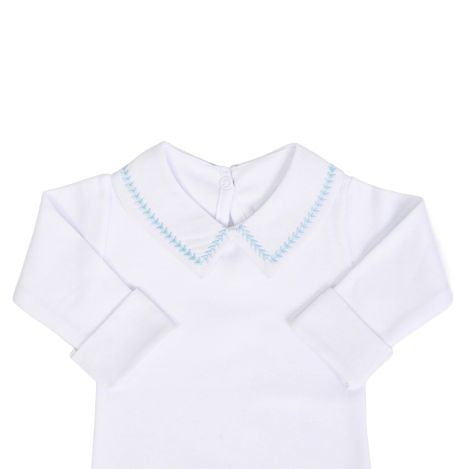 Bordado exclusivo – gola delicadamente bordada à máquina com raminhos em tom amarelo ouro.