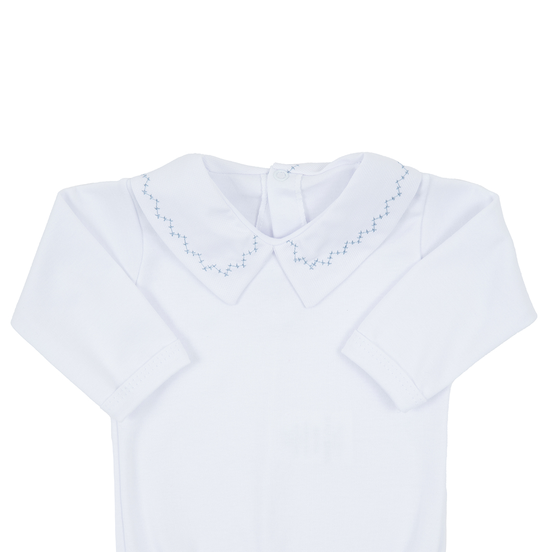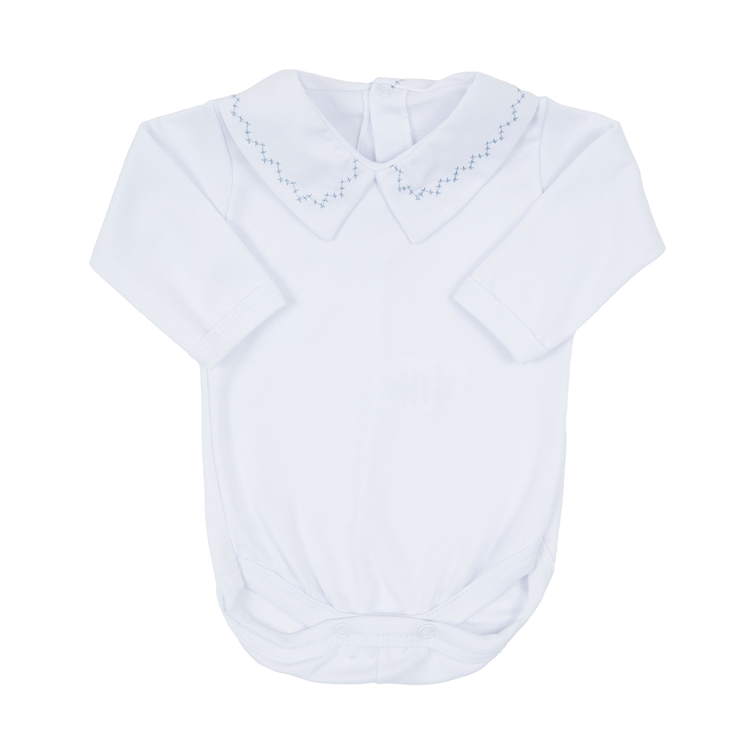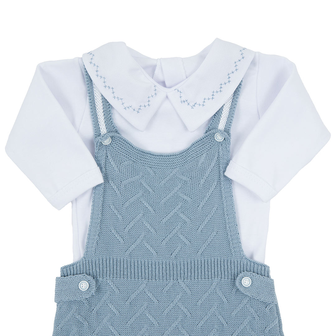 Acompanha um body em malha 100% algodão com bordado à máquina e detalhes em azul, que harmonizam perfeitamente com a jardineira. Uma combinação clássica e elegante, ideal para os primeiros registros e passeios do bebê.