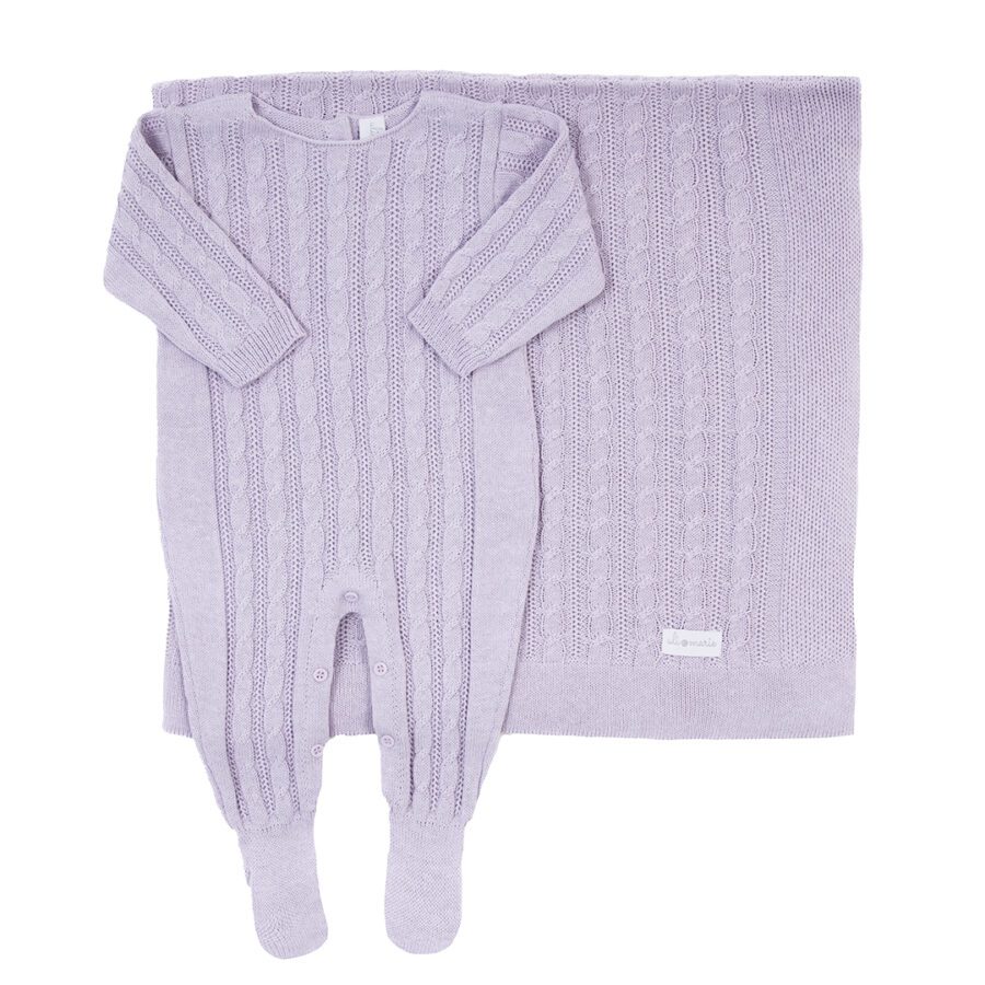 O nosso conjunto de gorro e luvas de tricot com delicados detalhes em trança é perfeito para manter o seu bebê quentinho e confortável na maternidade e nos primeiros passeios.