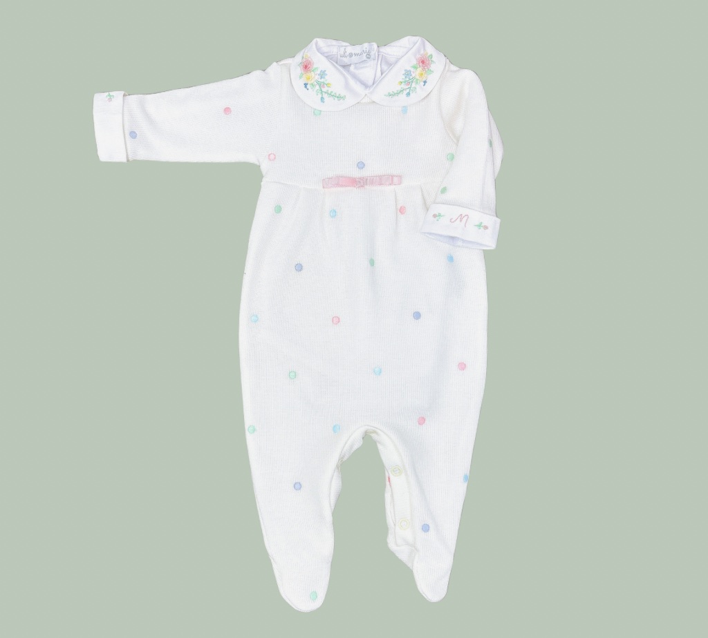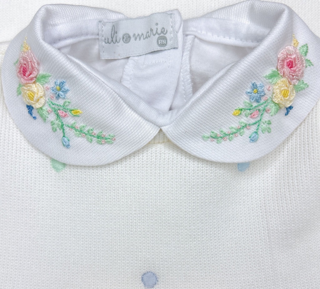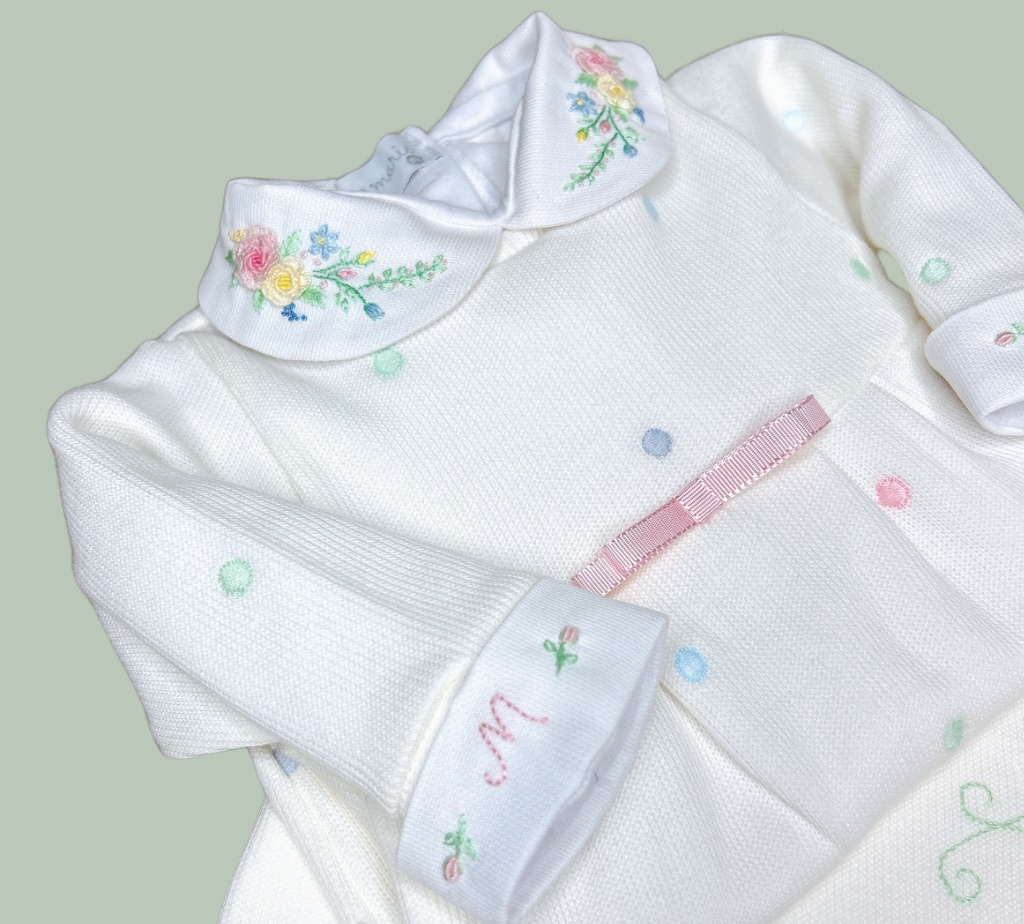 Acompanha um body branco 100% algodão, com gola bordada à mão em floral delicado e punhos personalizados com a inicial da bebê.