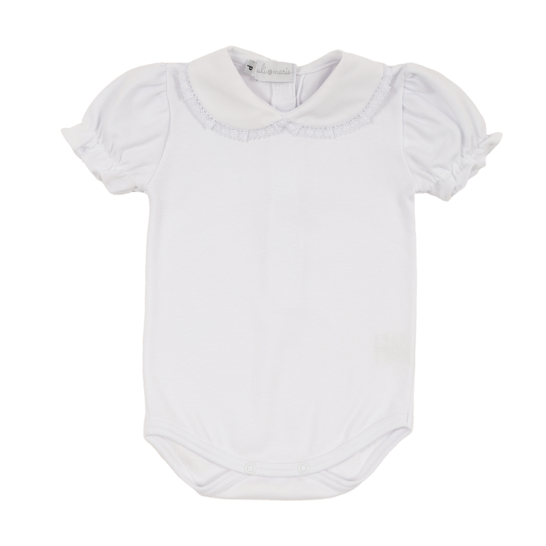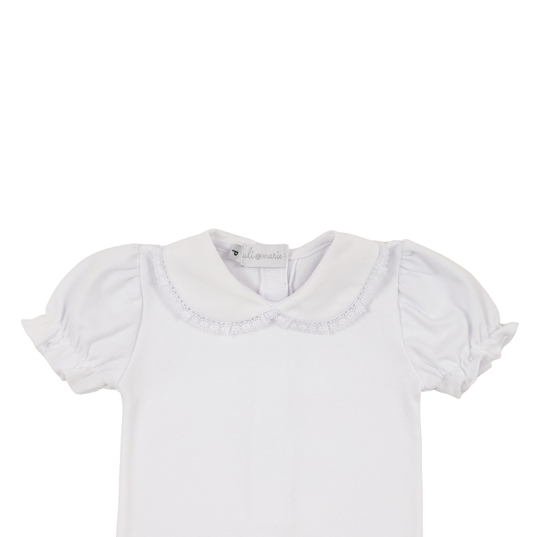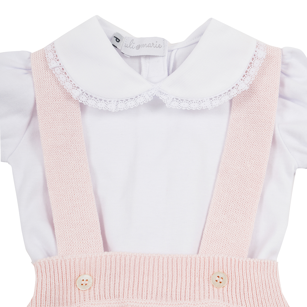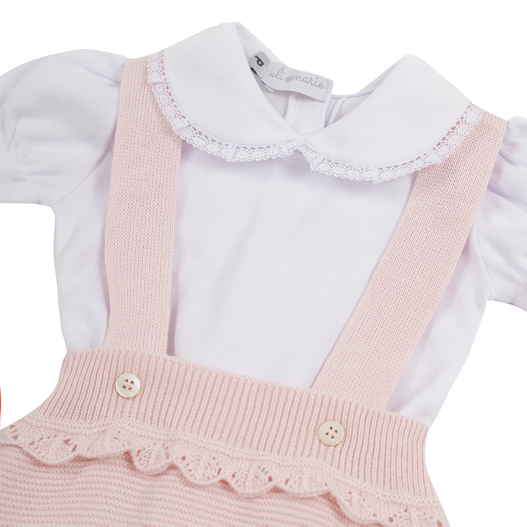 O romper apresenta um trabalho detalhado em tricot com botões delicados na cintura e entrepernas, facilitando a troca de fraldas com praticidade. Acompanha body em suedine 100% algodão, com gola redonda e aplicação de renda – um toque clássico que deixa a produção ainda mais romântica.