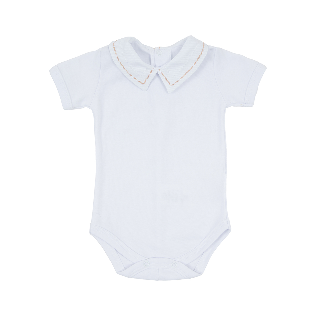 O kit acompanha um romper com um delicado trabalho em tricot, com botões nos ombros e nas laterais do quadril para facilitar a troca de fraldas, além de um body em suedine 100% algodão com gola reta, perfeito para completar o look.