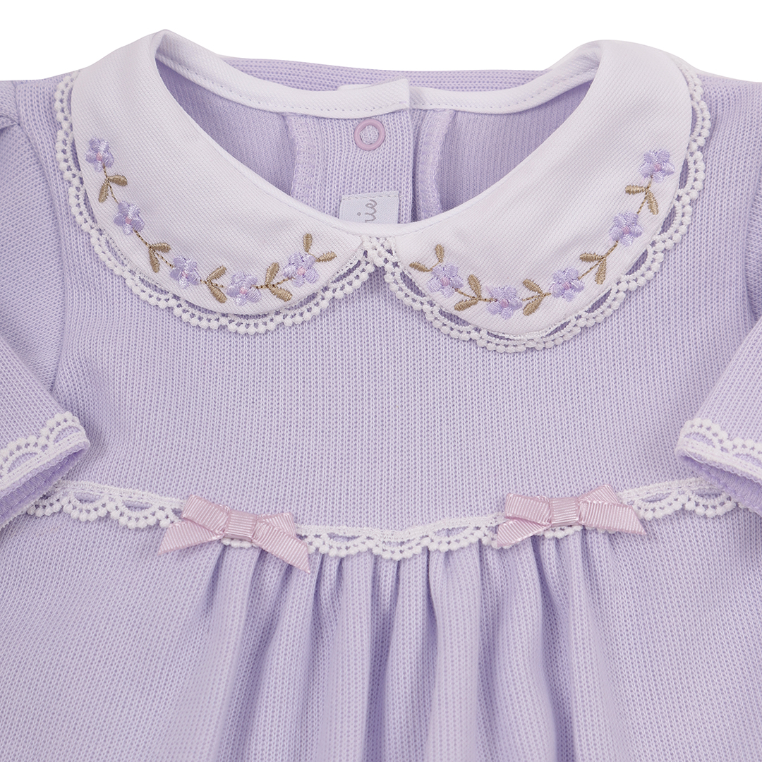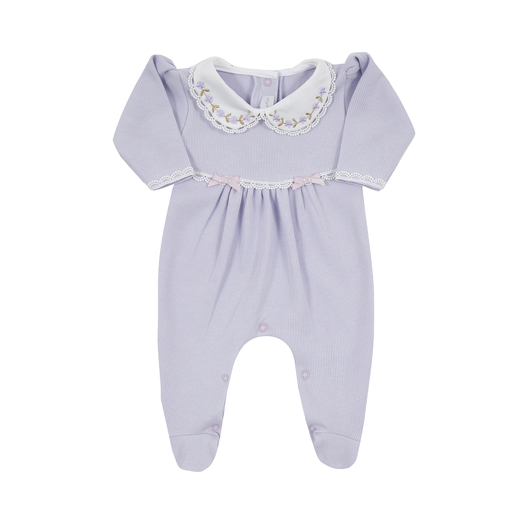 A Saída Maternidade Alice Lilás é a escolha ideal para mamães que desejam praticidade, conforto e sofisticação no primeiro look do bebê. Composta por duas peças – um macacão com golinha bordada de mini flores e uma manta combinando –, esse conjunto proporciona um visual harmonioso e encantador.