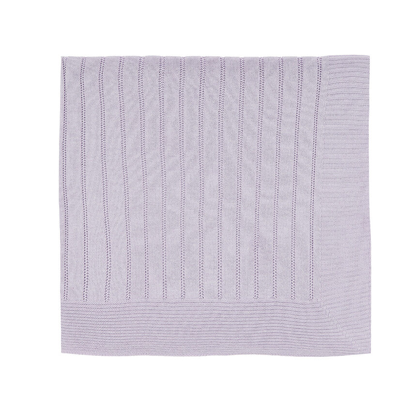 Manta combinando com detalhes em tricot no mesmo tom lilás, ideal para aconchegar o bebê nos primeiros dias.
