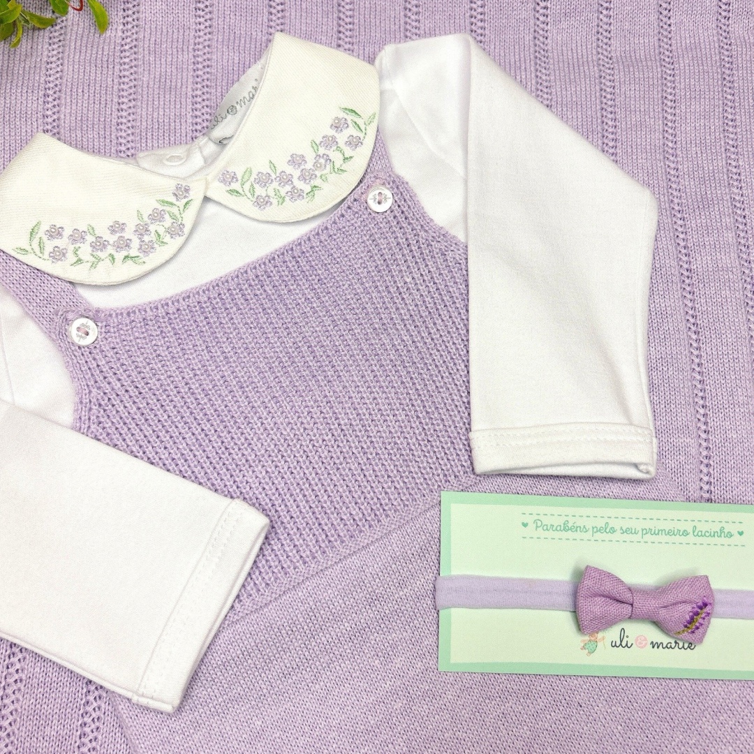 Saída Maternidade menina Lilás com Jardineira e Manta | Tricot Antialérgico – Uli&Marie