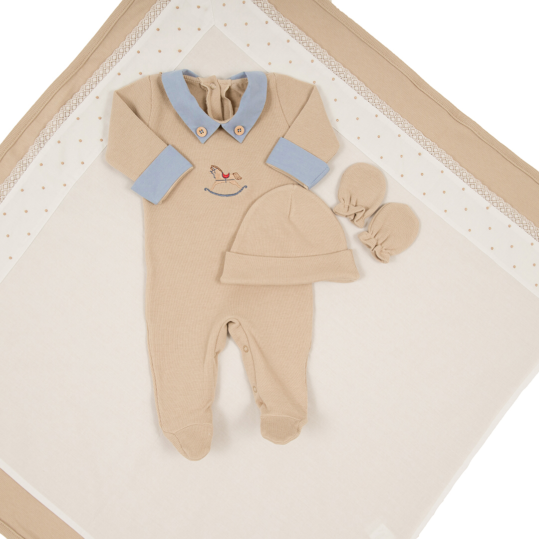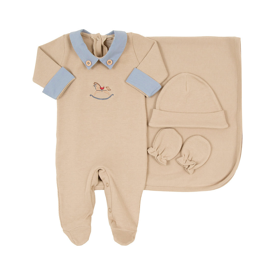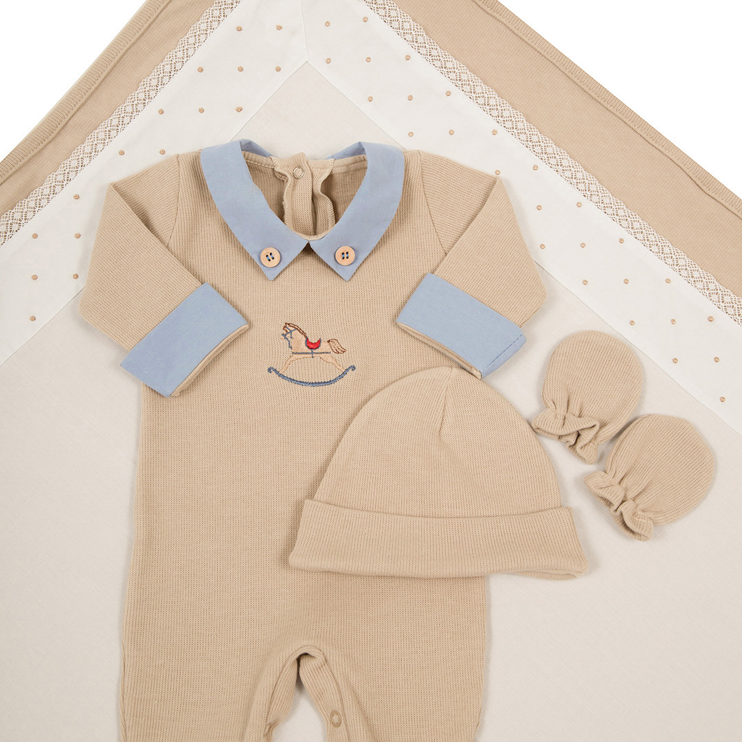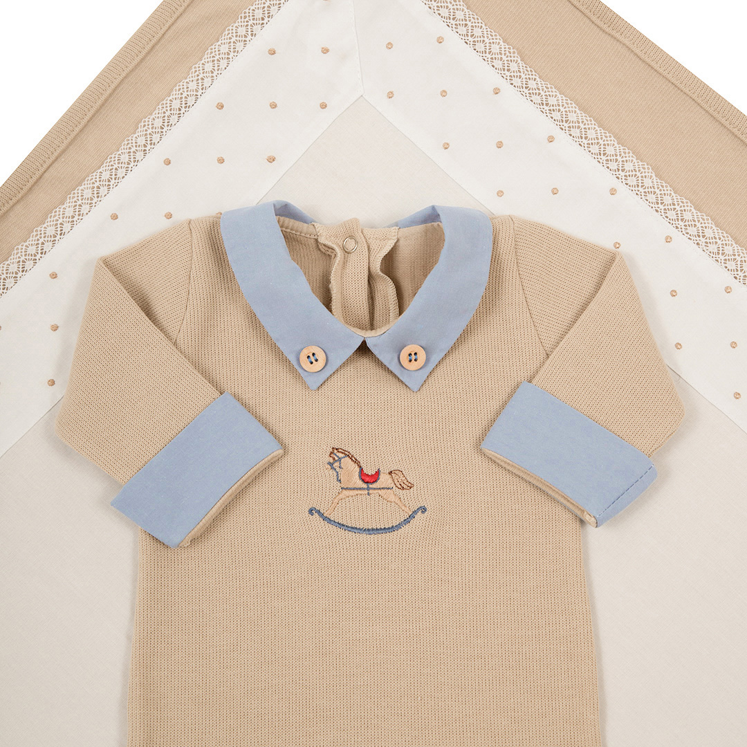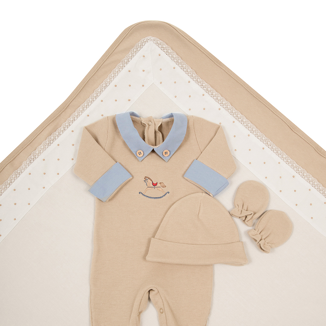 A Saída Maternidade Horse, na delicada combinação de azul e bege, é composta por 5 peças essenciais para os primeiros dias do seu bebê: