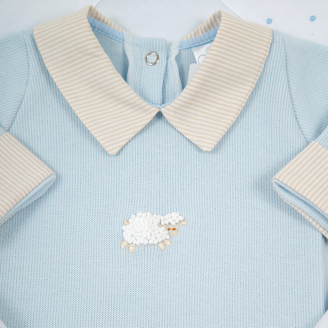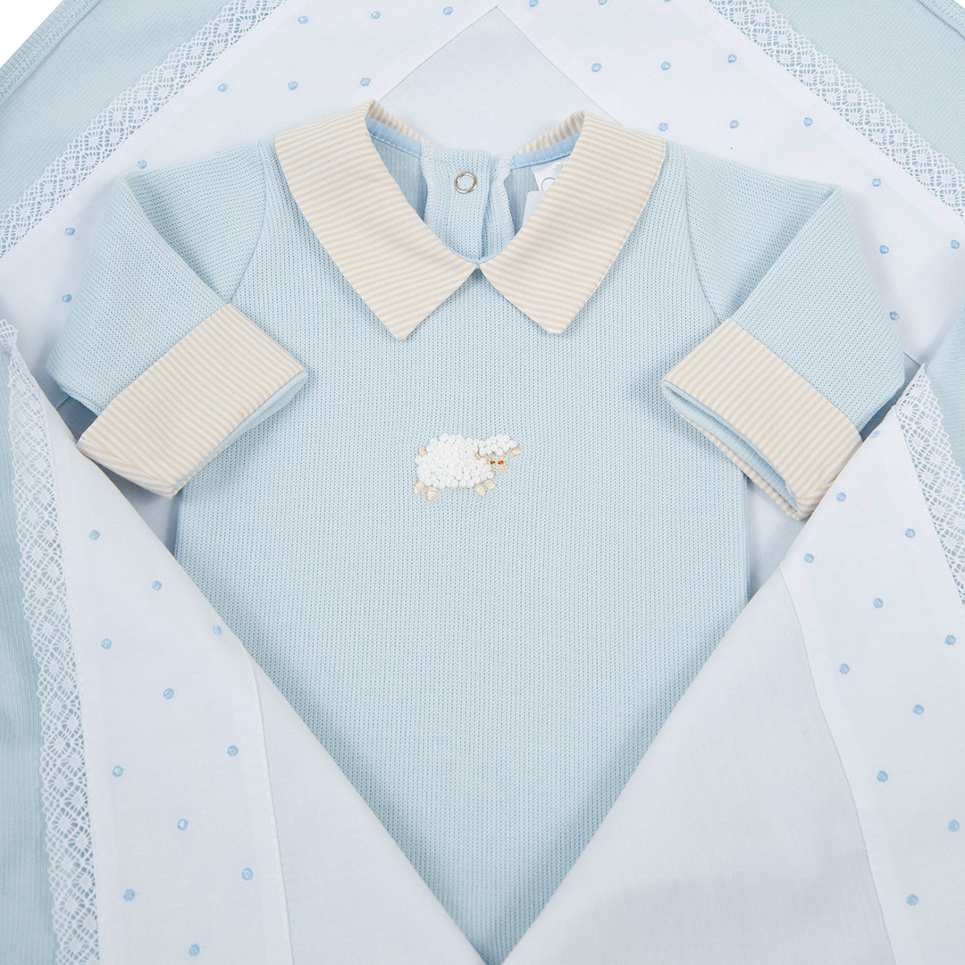 A Saída Maternidade Ovelha, na delicada combinação de azul e branco, é composta por 5 peças essenciais para os primeiros dias do seu bebê: