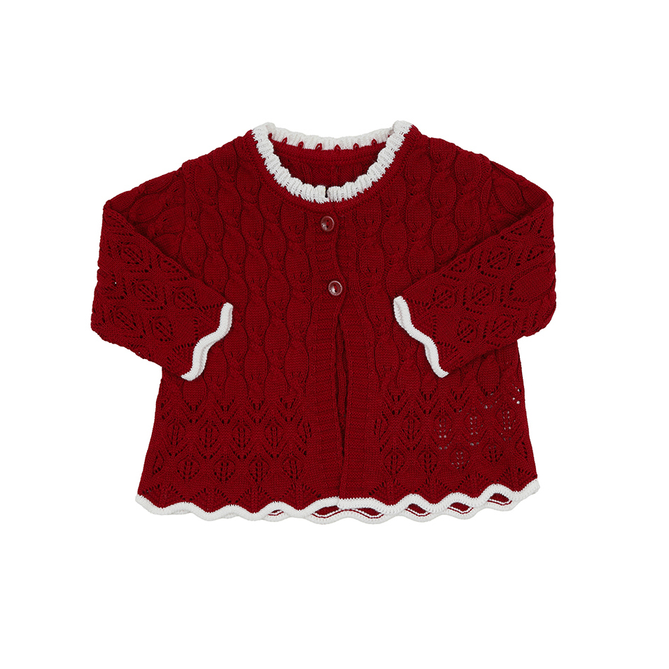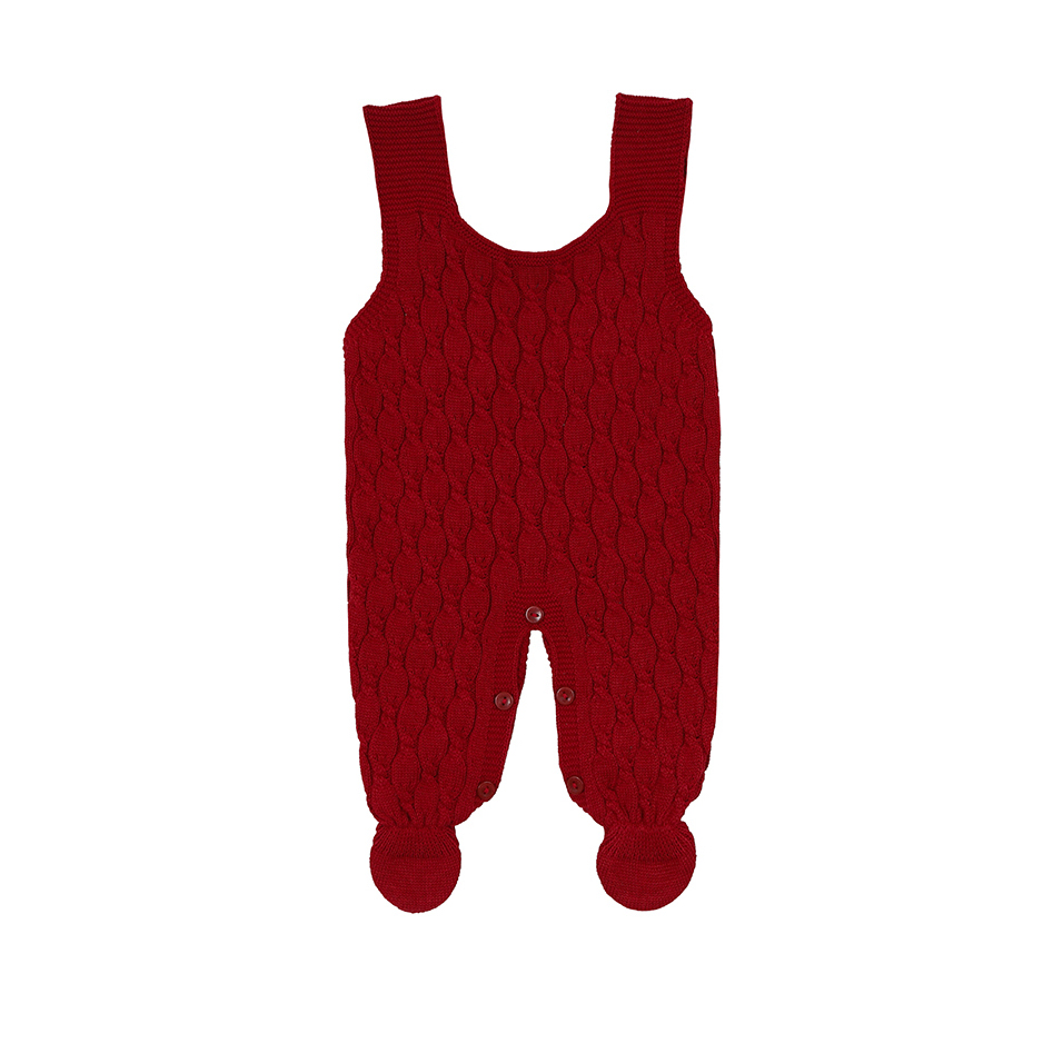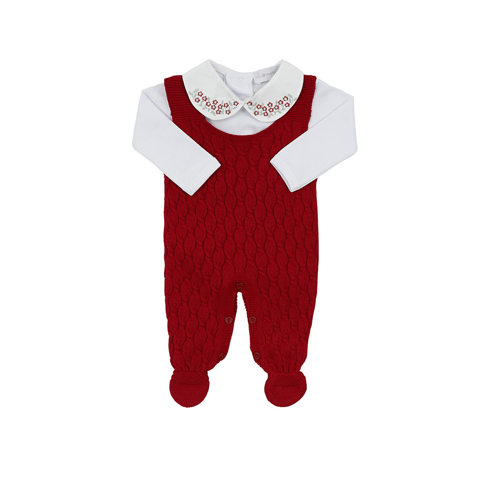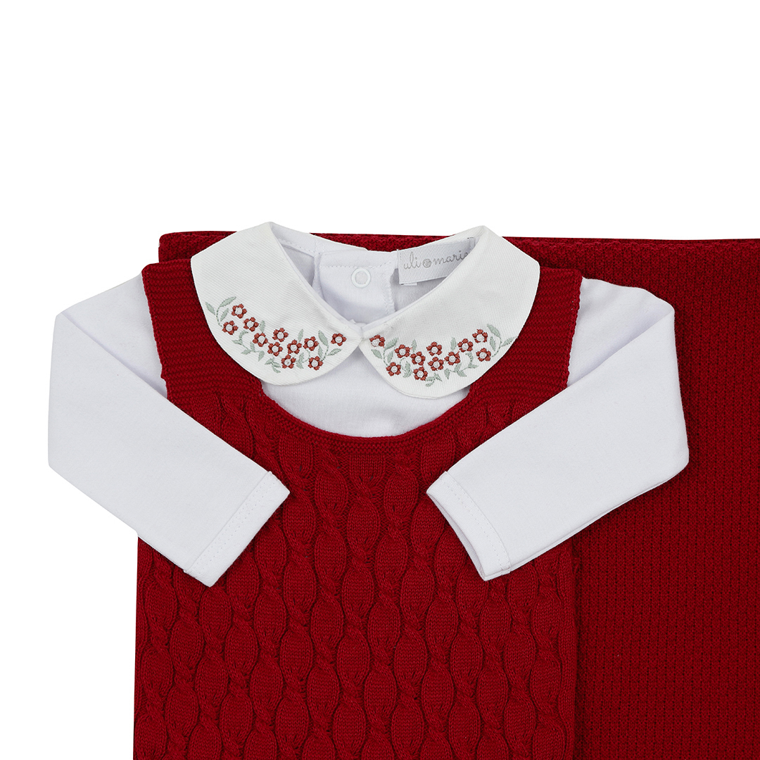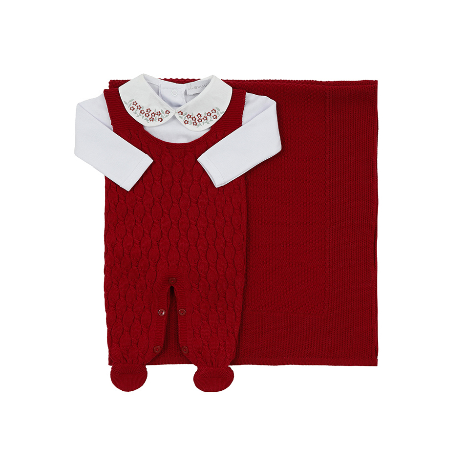 Saída Maternidade Julieta Vermelha com Jardineira, Casaquinho, Manta e Body | Tricot Antialérgico – Uli&Marie