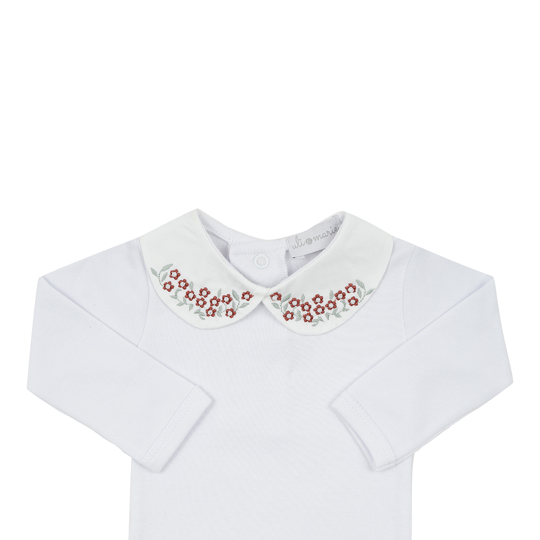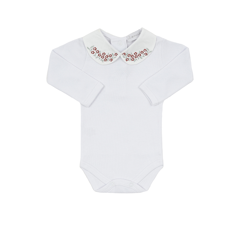 Body branco com mini flores e pérolas aplicadas