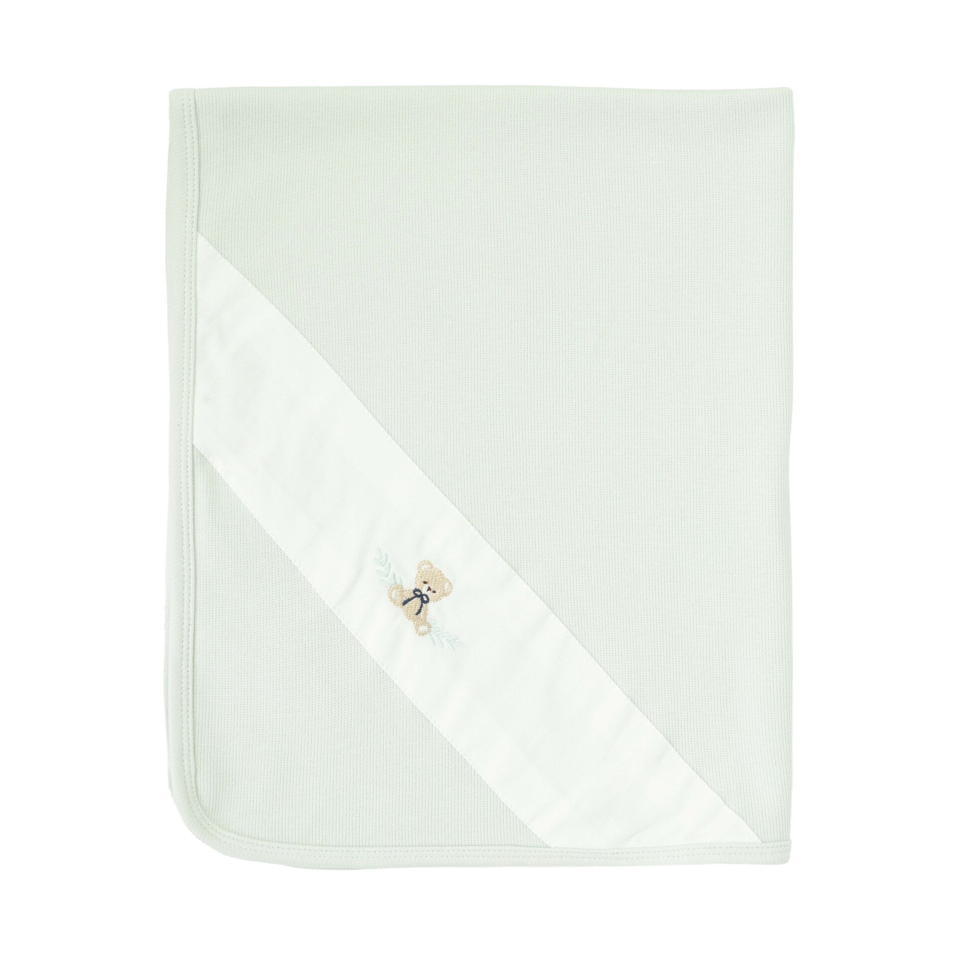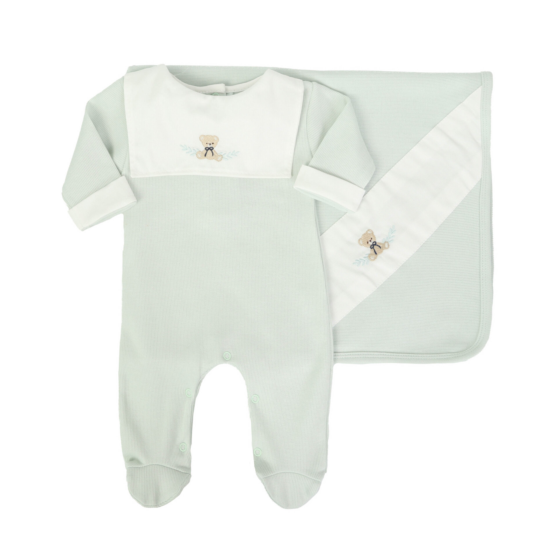 Manta bordada combinando com o macacão – toque especial e delicado.