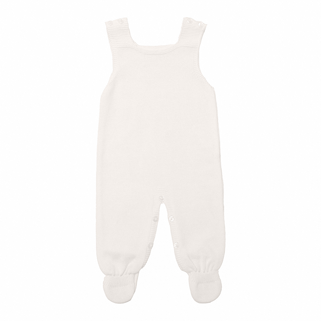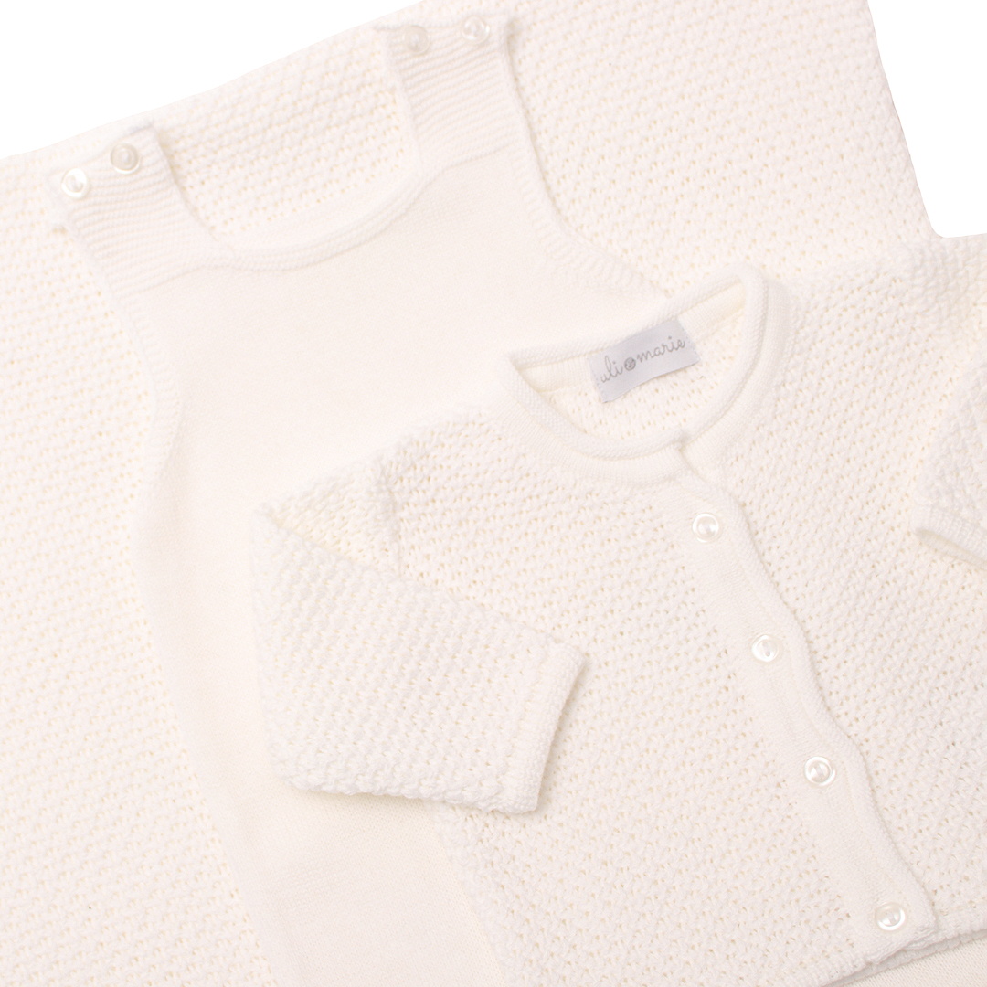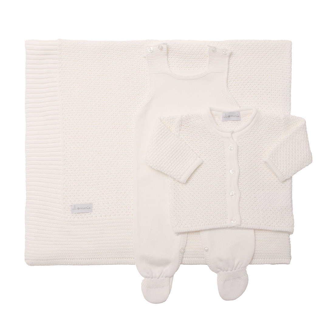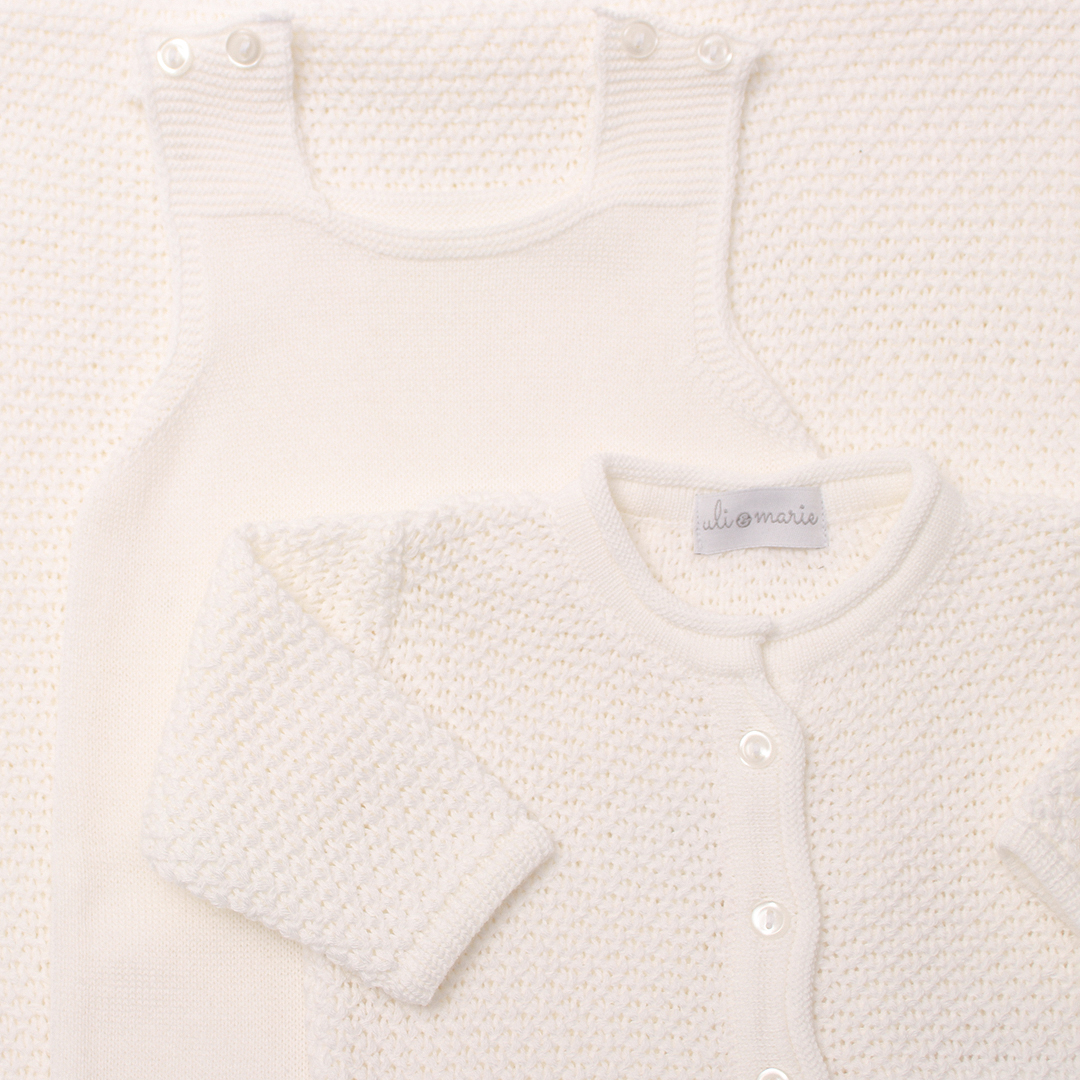 A jardineira possui abotoamento entre as perninhas e nos ombros para facilitar as trocas. O casaquinho e a manta apresentam o mesmo trabalho artesanal em tricot no ponto pipoca, criando um conjunto harmônico e delicado. Um kit perfeito para todas as estações: com o casaquinho para ambientes climatizados e apenas a jardineira em locais mais quentes.