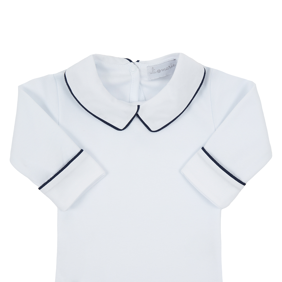 Body 100% algodão com gola reta, viés azul marinho e vira no punho