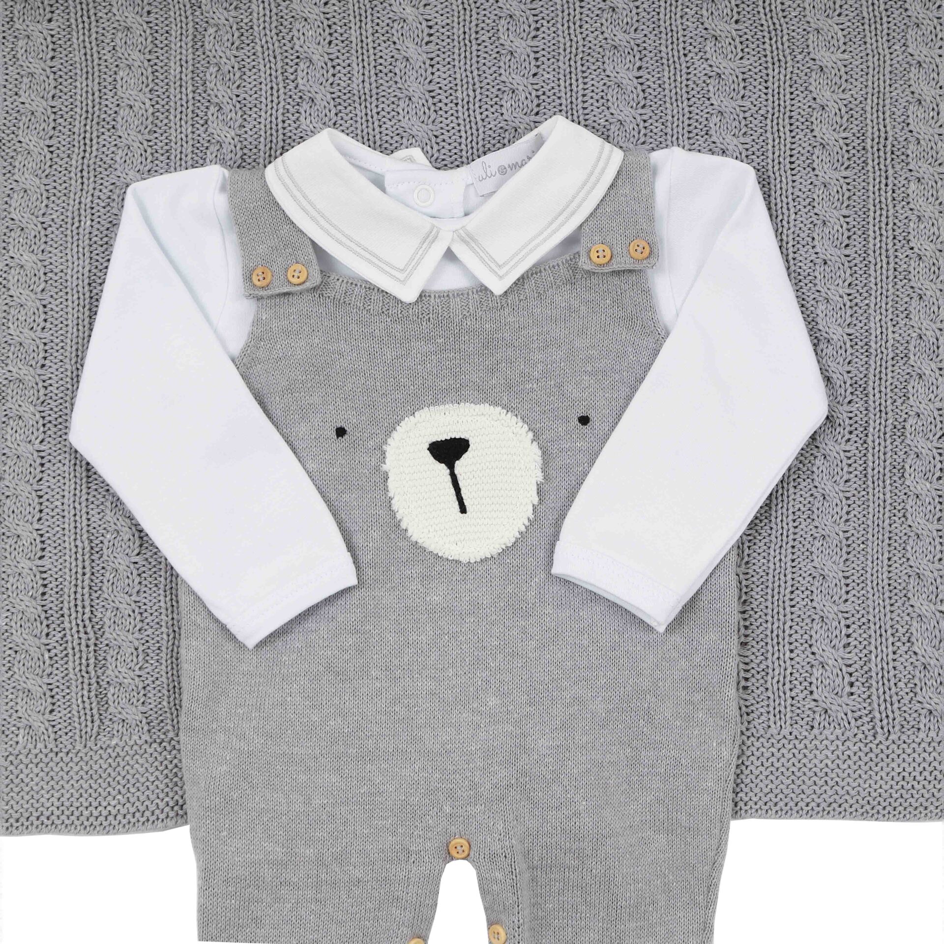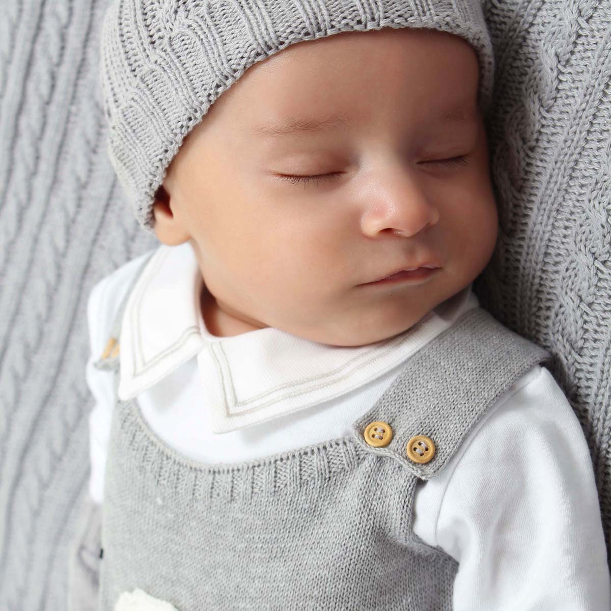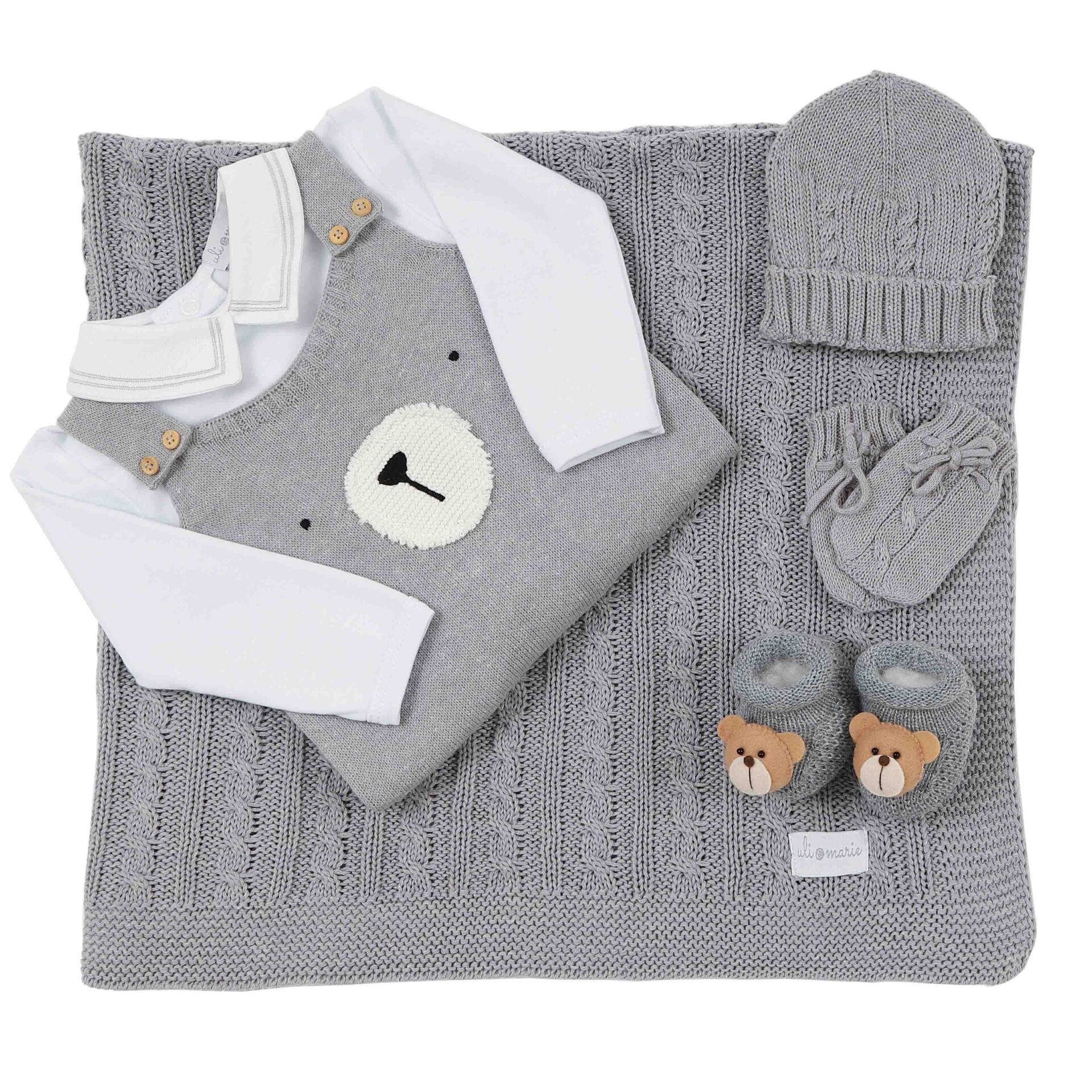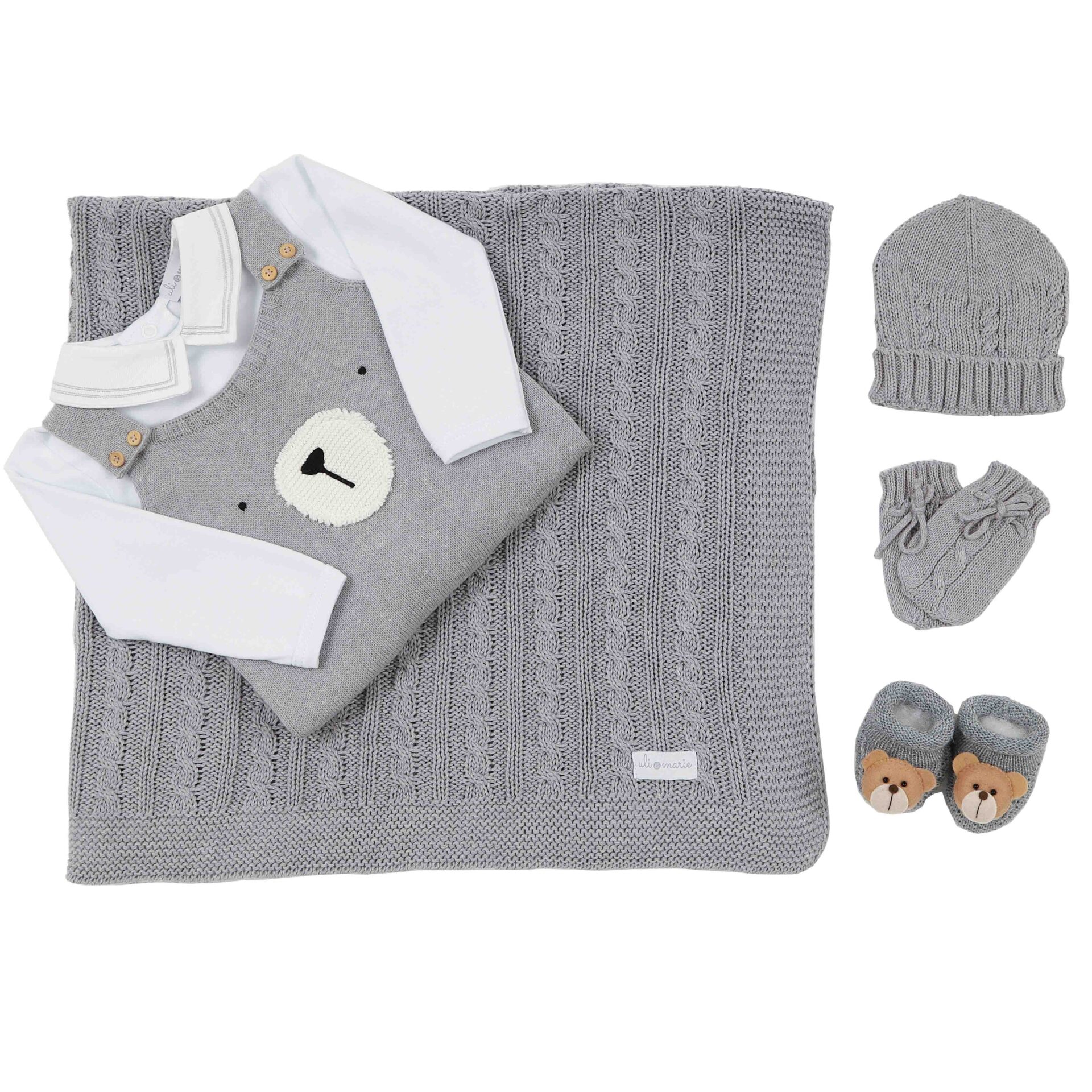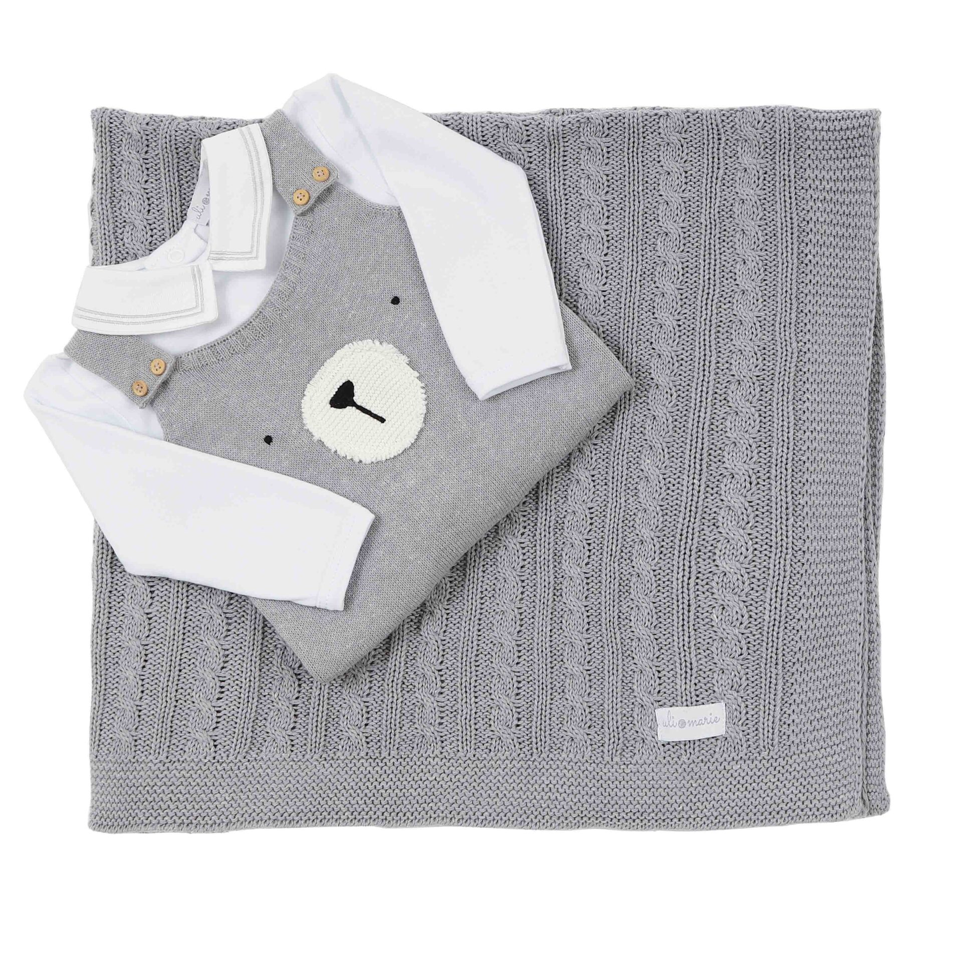 A Saída Maternidade Teddy Cinza é um conjunto delicado e funcional, pensado para os primeiros momentos do bebê. O kit é composto por 3 peças: uma jardineira em tricot antialérgico, um body branco bordado à máquina em 100% algodão e uma manta trançada na mesma cor da jardineira (80×80 cm).